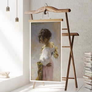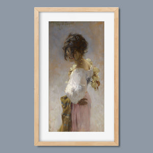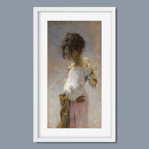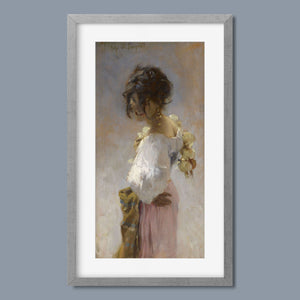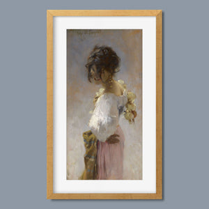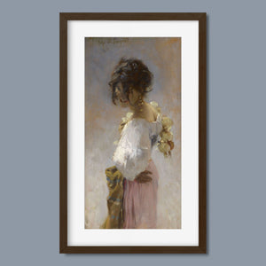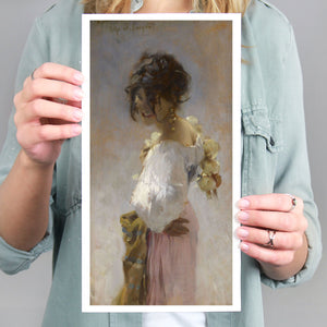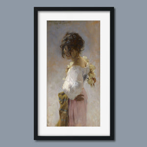 Rosina by John Singer Sargent featuring a woman in a white blouse with rosy cheeks, portrayed in soft light and surrounded by flowers in a vintage style.