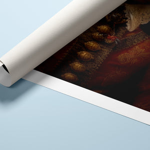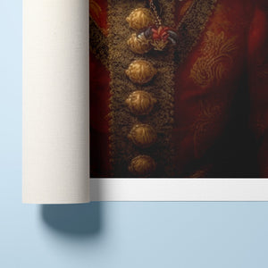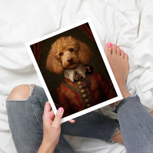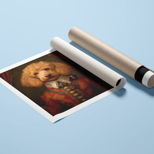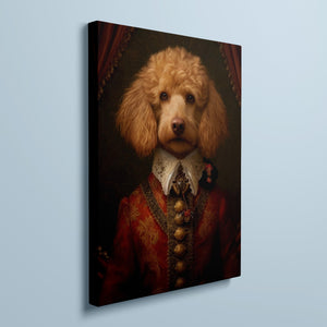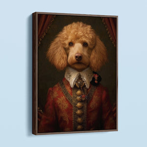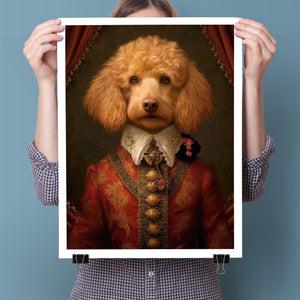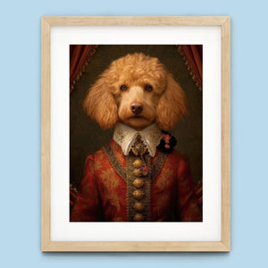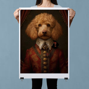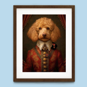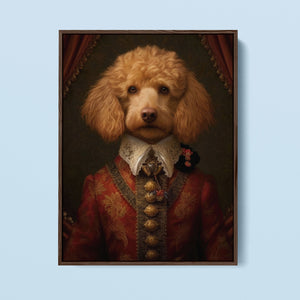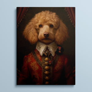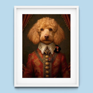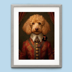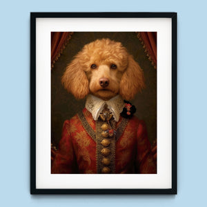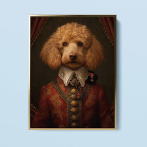 Royal Golden Doodle Charles is a whimsical and regal portrait capturing a golden doodle dressed in ornate aristocratic attire. With detailed vintage elements, this piece combines humor and sophistication, showcasing the playful elegance of a beloved canine in a historical costume. Ideal for those who appreciate both art and pets, this portrait is a charming addition to any space, bringing a touch of luxury and lightheartedness to your decor.
