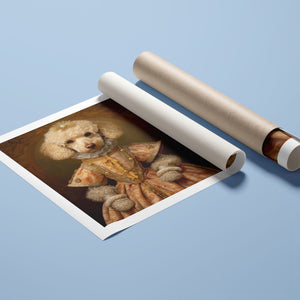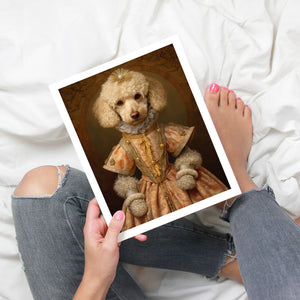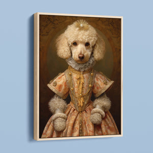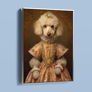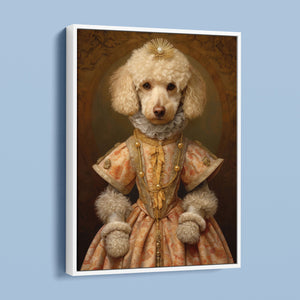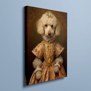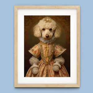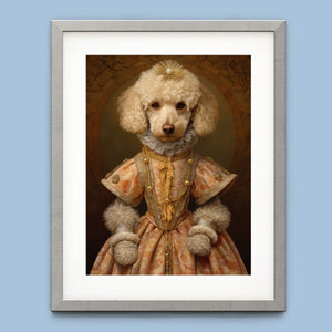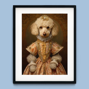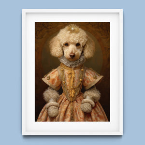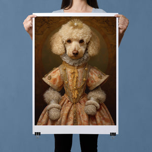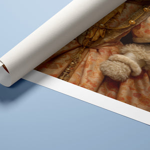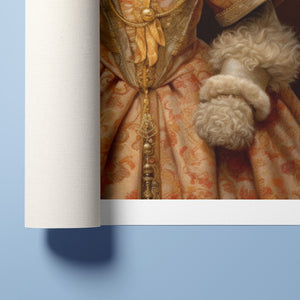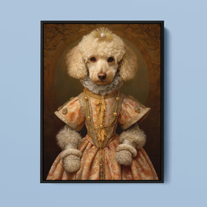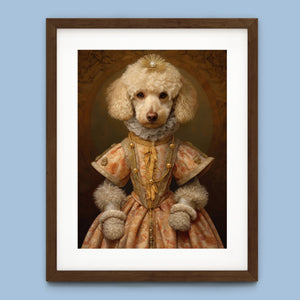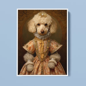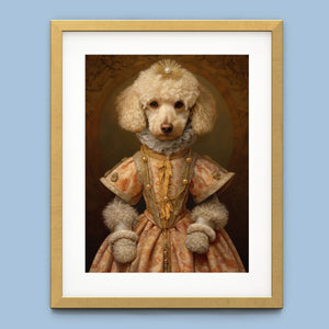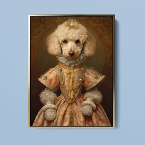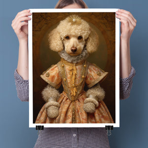 The Royal Golden Doodle Princess is a delightful and whimsical portrayal of a poodle mix adorned in luxurious, regal attire. This 3x4 vertical artwork combines retro and vintage styles with humor, featuring the canine princess in a lavish costume complete with a pearl-studded ruff collar, intricate floral patterns, and majestic jewelry. The golden fur of the doodle contrasts beautifully with the rose gold, white, bronze, and beige tones, creating an artistic satire that celebrates the noble spirit of our beloved pets. Perfect for adding a touch of royal elegance with a playful twist to any space.