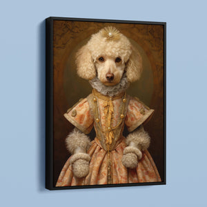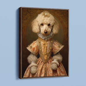 Whimsical portrait of a golden doodle in regal attire with a pearl-studded ruff collar, jewelry, and floral patterns. Retro vintage style in rose gold, bronze, and beige.