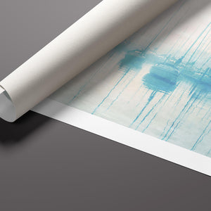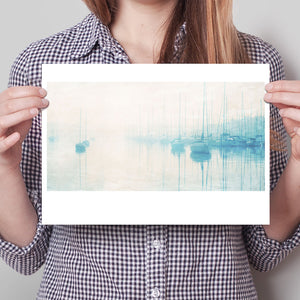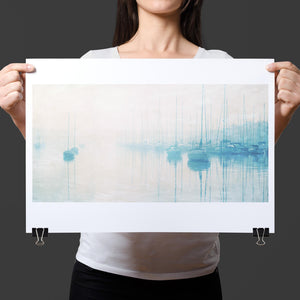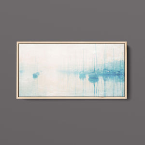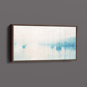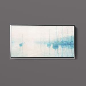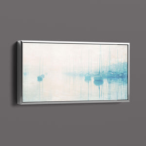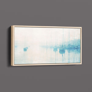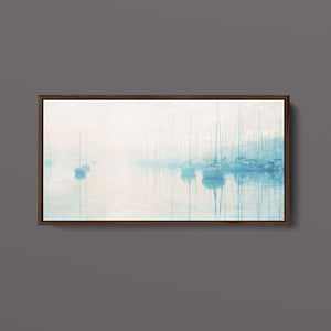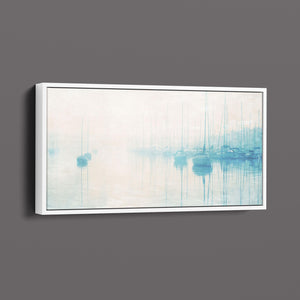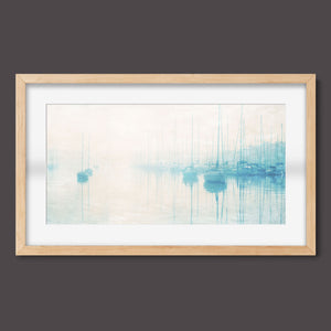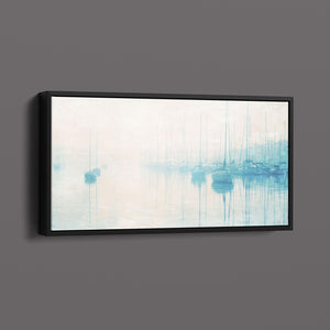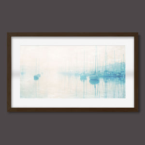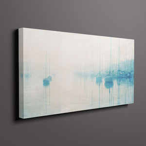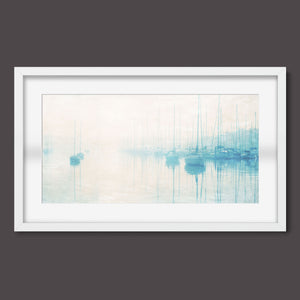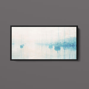 "Safe Harbor" is a serene contemporary landscape that captures the tranquil essence of a coastal marina. This horizontal artwork features soft blue and beige tones, depicting moored sailboats gently reflecting on calm waters enveloped in a delicate morning mist. The hazy atmosphere and pastel colors evoke a sense of peace and stillness, inviting viewers to experience the quietude of a misty morning by the sea. Perfect for coastal lovers, this piece brings a soothing ambiance to any space, creating a perfect escape into a tranquil nautical setting.