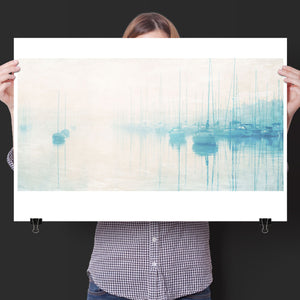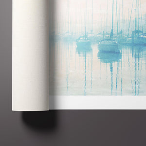 Tranquil coastal landscape art featuring moored sailboats in soft blue and beige hues, reflecting on calm waters under a misty morning sky, symbolizing peace and serenity.