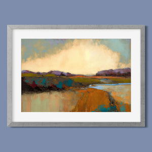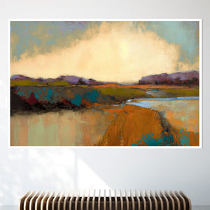*Sanoma Sunrise V* is a vibrant abstract painting that captures the serene beauty of a sunrise over a tranquil landscape. With warm tones of beige, blue, and gray, this piece reflects the soft light of dawn as it illuminates the horizon and creates peaceful reflections on the water. The textured canvas and gentle brushstrokes evoke a sense of calm, making it a perfect representation of nature's harmony. This contemporary artwork blends impressionist inspiration with modern abstraction, ideal for adding a touch of serene beauty to any space.