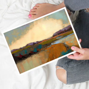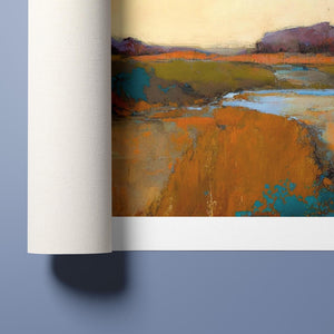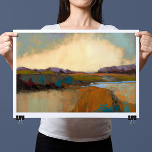 An abstract landscape painting with warm tones, soft textures, and peaceful reflections, evoking the calm of sunrise over a tranquil riverbank.