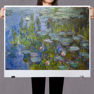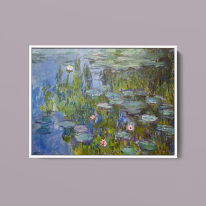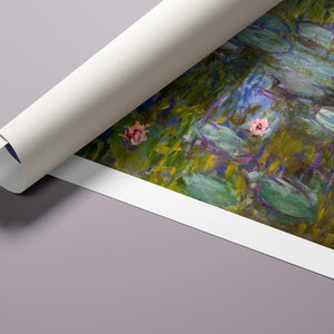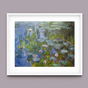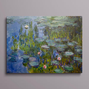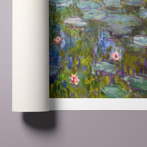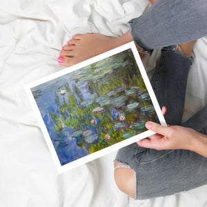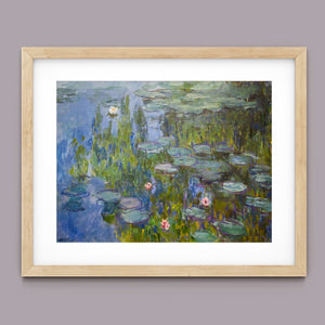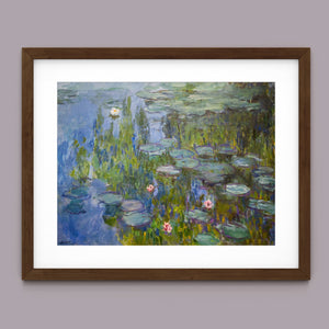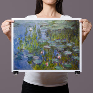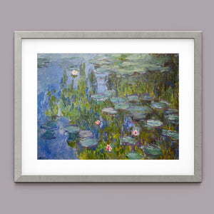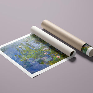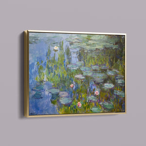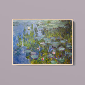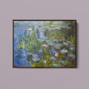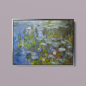 Vintage Impressionist painting "Seerosen" by Claude Monet, showcasing tranquil water lilies and a serene pond with luminous colors and lush botanical elements.