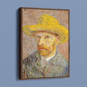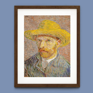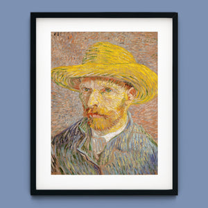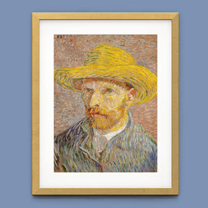 Vintage Post-Impressionist self-portrait by Vincent van Gogh, featuring the artist in a straw hat, intense gaze, and vibrant brushwork in blue and yellow tones.