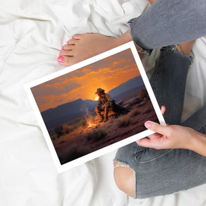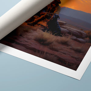 "Settin' Down Dusty Roots" showcases a rugged cowboy and his dog enjoying a quiet evening by a campfire at sundown. The artwork reflects the cowboy lifestyle and the tranquil beauty of the American West at twilight.