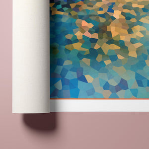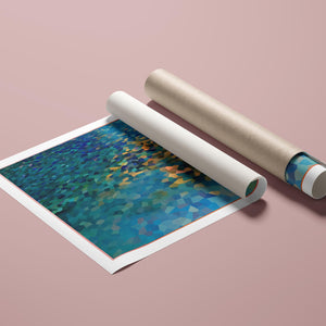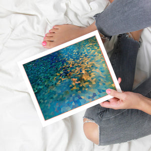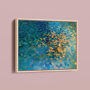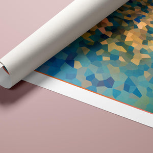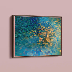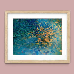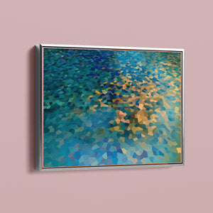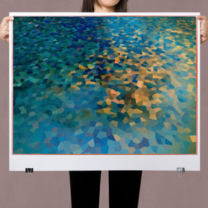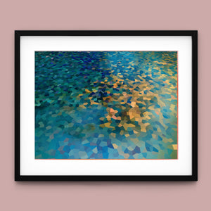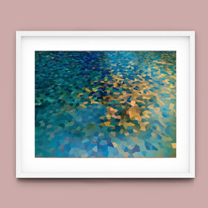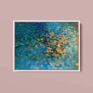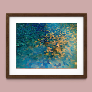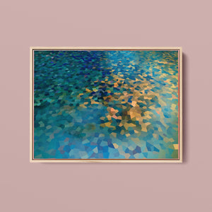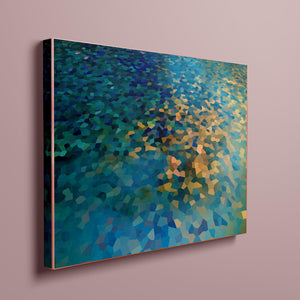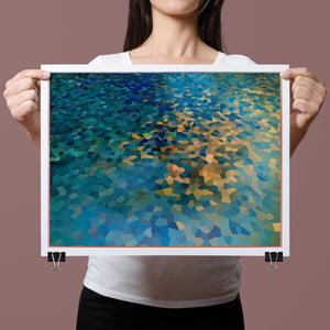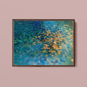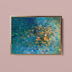 "Shallow Depth" is a visually captivating abstract mosaic art piece characterized by its geometric patterns and vibrant color palette. Horizontal in format (4x3), this modern artwork integrates shades of blue, green, navy, and gold, creating a tranquil and aesthetically pleasing visual experience. The mosaic design features a harmonious blend of aquamarine, teal, and tan tiles, arranged in a tessellated pattern that evokes a sense of depth and calm. The artwork's intricate geometric shapes and textures are perfect for adding a touch of contemporary elegance to any space.