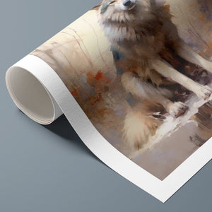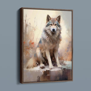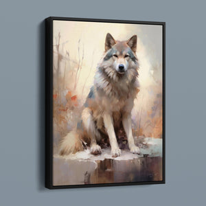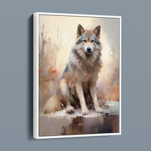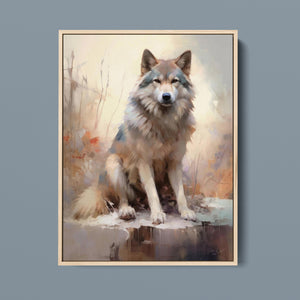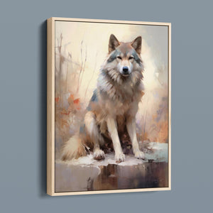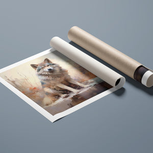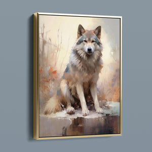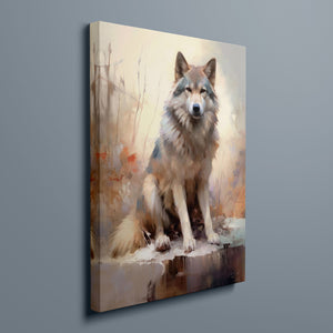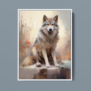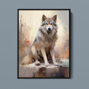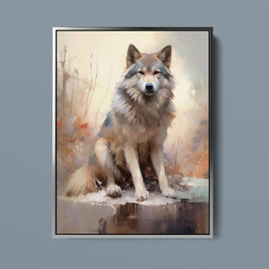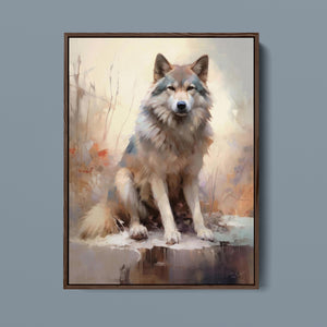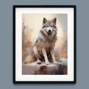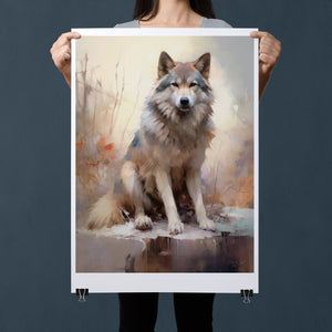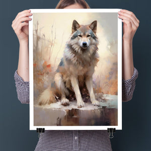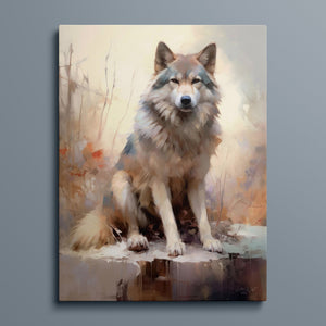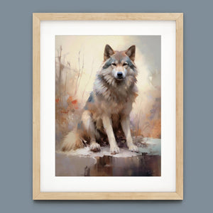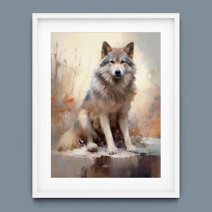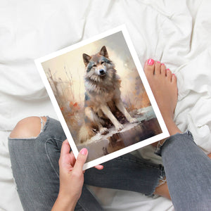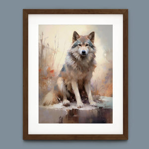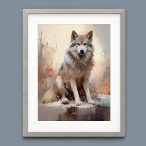 "Sitting Pretty" portrays a wolf in a contemporary watercolor style, nestled in the Rocky Mountains. The artwork highlights the wolf’s presence with subtle pastel hues, surrounded by serene elements like lakes, streams, and trees, reflecting the beauty of the wild.