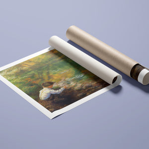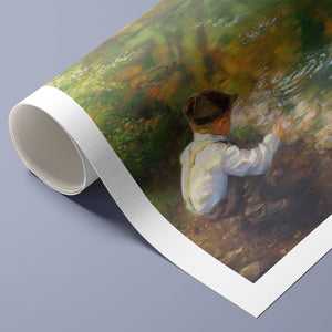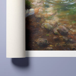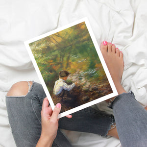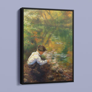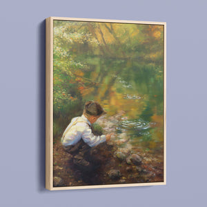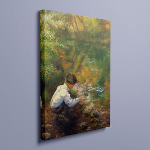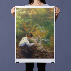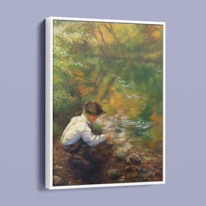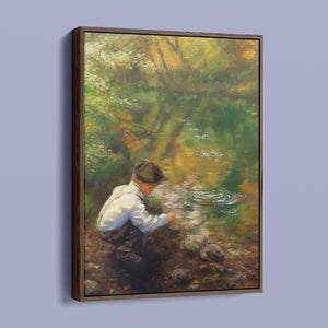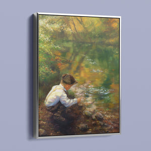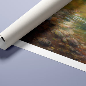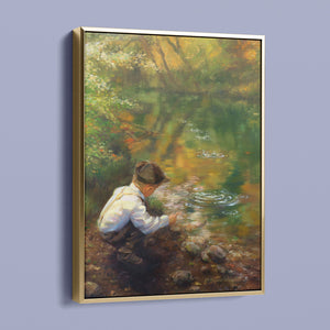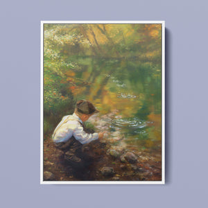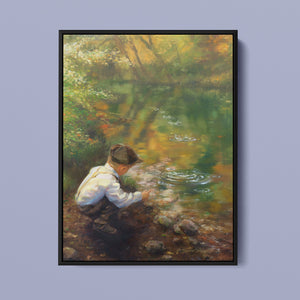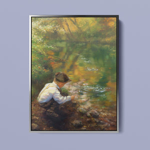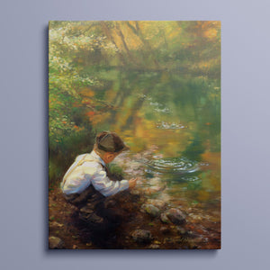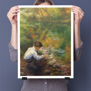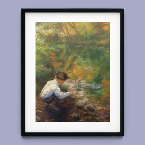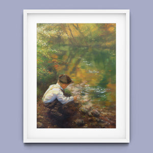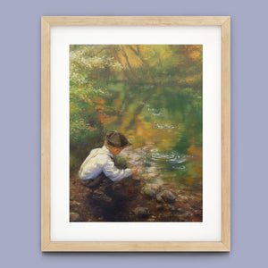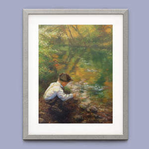 Embrace the tranquility of autumn with Skipping Six, a serene artwork depicting a child skipping stones by a creek. The painting captures the peaceful solitude and joyful concentration of a youth engaged in this timeless outdoor play, surrounded by golden hour reflections and lush foliage. Rendered in soft greens, browns, and yellows, this piece beautifully evokes the serenity of nature and the innocence of childhood.