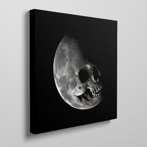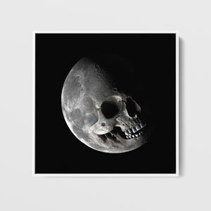 Illustration of the moon's surface with craters forming a skull shape, rendered in black and white to evoke a haunting, gothic atmosphere with elements of darkness and surrealism.