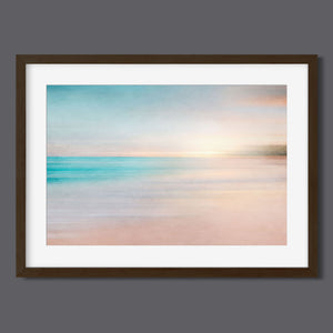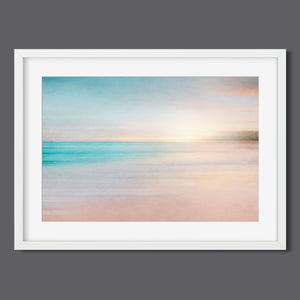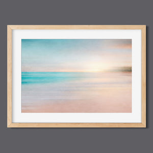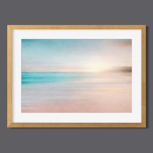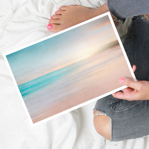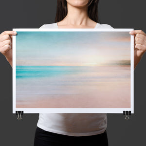 Abstract seascape with pastel tones, blending blues, beiges, and yellows in a soothing horizon.