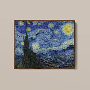 Same high quality gallery-wrapped stretched canvas showcased in a distinctive wood float frame. Available in Black, White, Silver, Gold, Natural/Oak, or Walnut/Espresso.