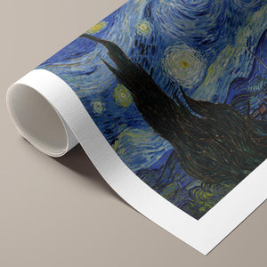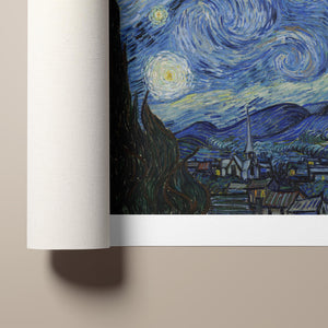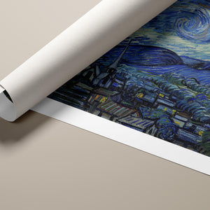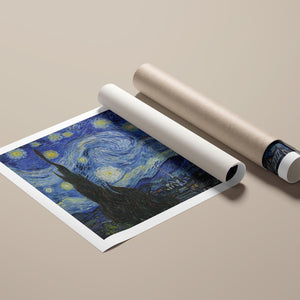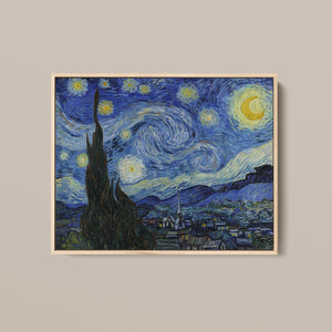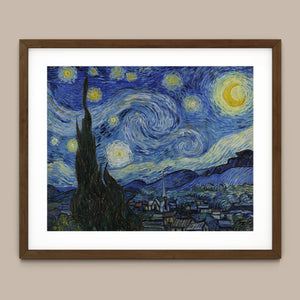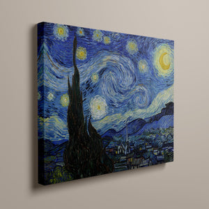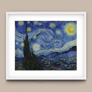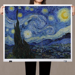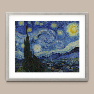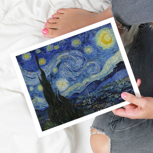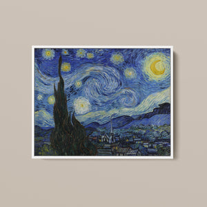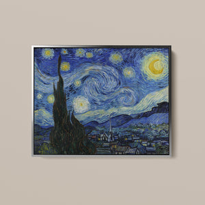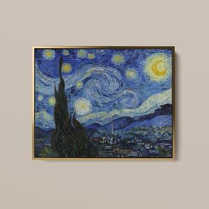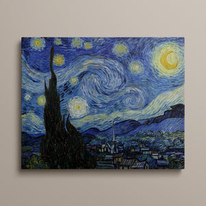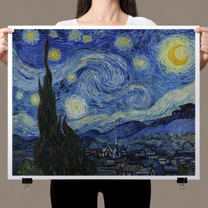 "Starry Night" by Vincent Van Gogh, painted in 1889, is one of the most iconic works in art history. This masterpiece captures a swirling, expressive night sky over a quiet village, showcasing Van Gogh’s distinctive brushwork and vibrant use of color. The painting features a dramatic, turbulent sky with luminous stars and a crescent moon, set against a serene, rolling landscape. Van Gogh's dynamic strokes and bold, contrasting colors create a sense of movement and emotional intensity, reflecting his unique artistic vision. The scene, viewed from the window of Van Gogh’s asylum room at Saint-Rémy-de-Provence, combines elements of both reality and imagination, offering a profound and emotive portrayal of the night sky. "Starry Night" remains a powerful representation of Van Gogh's ability to convey deep emotion through his distinctive, innovative style.