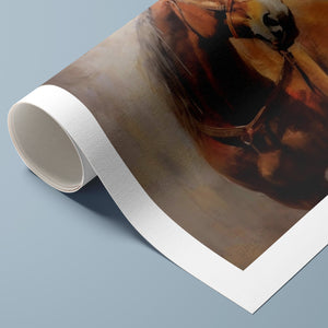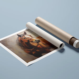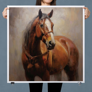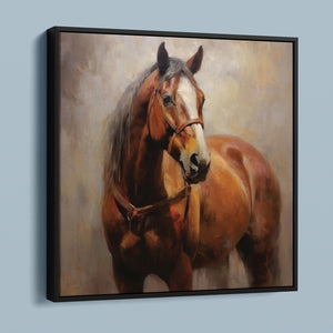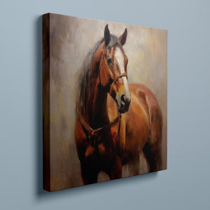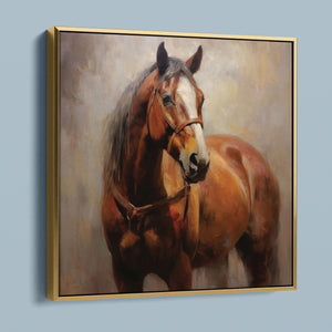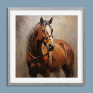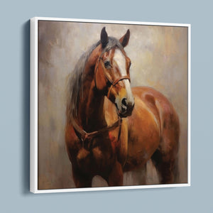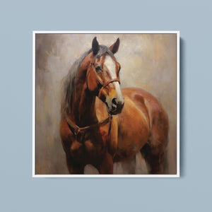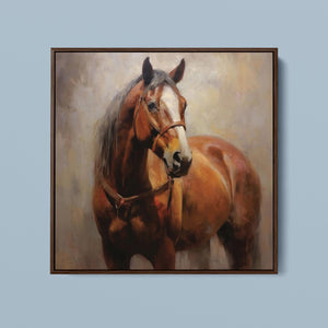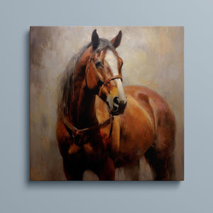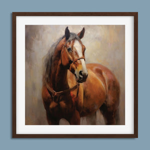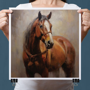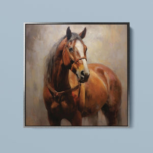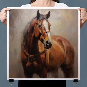 "Steadfast" presents a classic oil painting of a brown horse with a white marking, embodying the strength and elegance of equestrian life. This portrait captures the horse in a moment of poised motion, reflecting the timeless beauty and steadfast spirit of quarter horses. With its vintage and western charm, this artwork pays tribute to the enduring legacy of American rural and farm life.