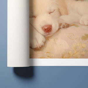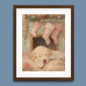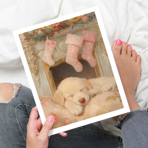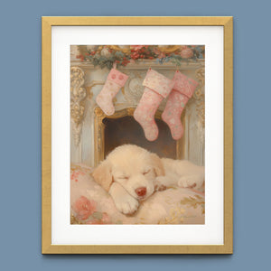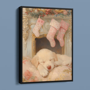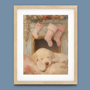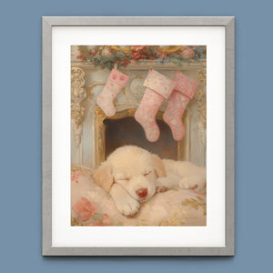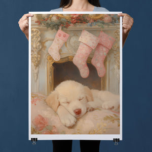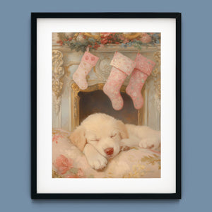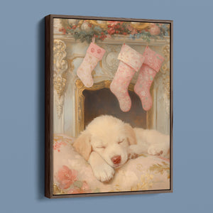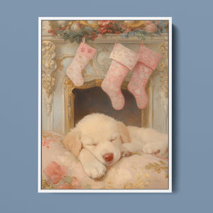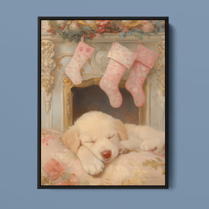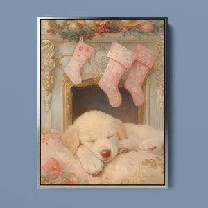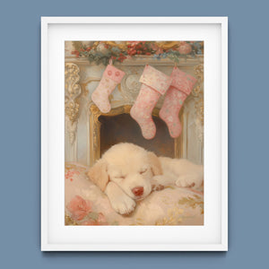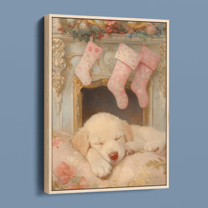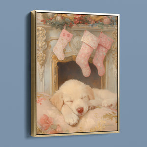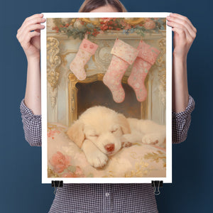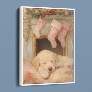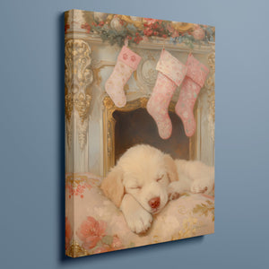 Detailed painting of a sleeping puppy nestled by an elegant fireplace with hanging Christmas stockings, rendered in soft vintage tones and influenced by James Christensen’s whimsical style.
