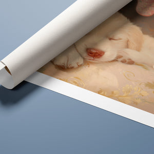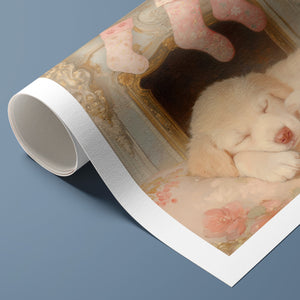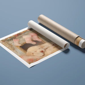 Sugar Plum Dreams captures the enchanting beauty of a cozy holiday moment, where a sweet puppy peacefully sleeps in front of a beautifully decorated fireplace. With Christmas stockings hanging in anticipation, the scene is bathed in soft vintage hues, evoking warmth and nostalgia. Painted in the detailed, whimsical style of James Christensen, this artwork brings to life the magic of Christmas, making it the perfect addition to your seasonal decor. Let the calm and comfort of this festive scene fill your home with holiday cheer.