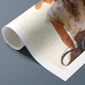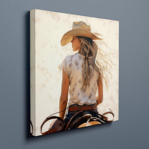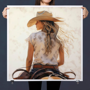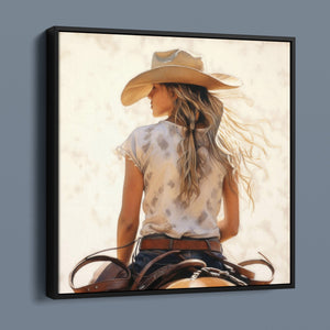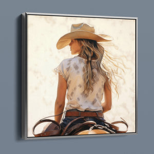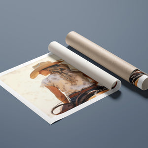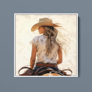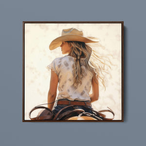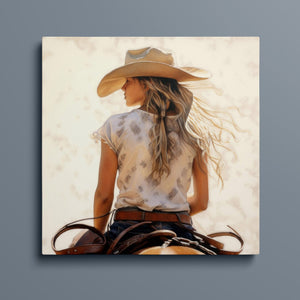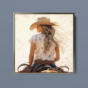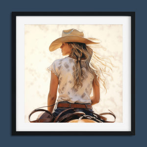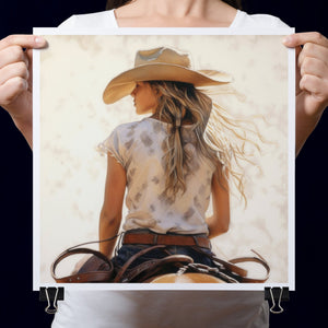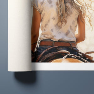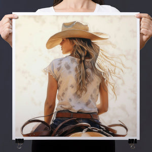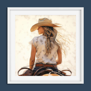 This dynamic watercolor portrait captures the essence of the wild west with a cowgirl riding her horse across a sun-drenched desert landscape. The warm hues of the setting sun and the flowing movement of horse and rider evoke a sense of freedom and adventure. Perfect for lovers of western art, "Sun and Saddle" radiates the spirit of the open plains and the bond between horse and rider.