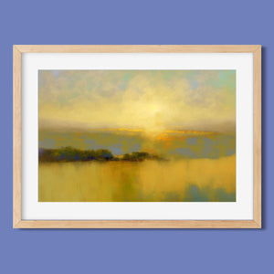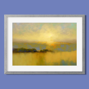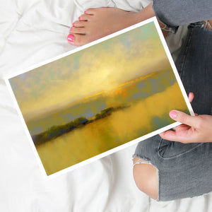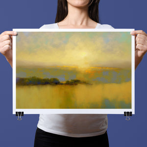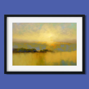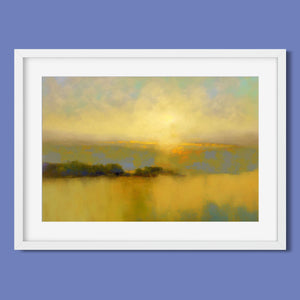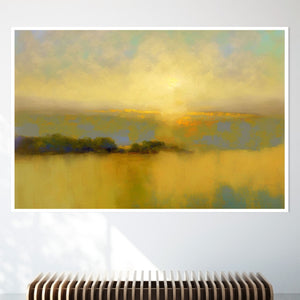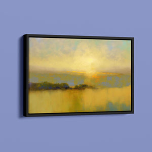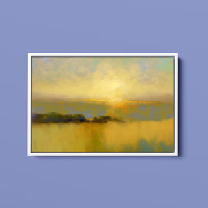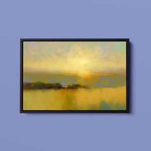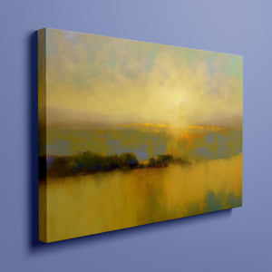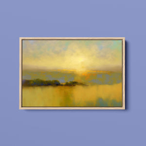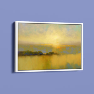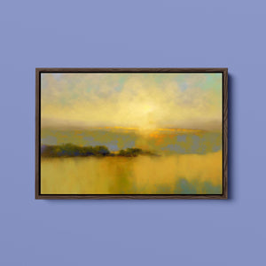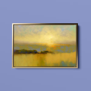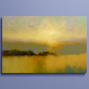 "Sunbreak" is an enchanting landscape artwork that captures the tranquil moment of sunrise, enveloped in soft hues of orange, yellow, and blue. This abstract piece evokes a sense of calmness as gentle mist rises from the water, creating an ethereal atmosphere. The glowing sunbeams illuminate the serene horizon, inviting viewers to bask in the warmth and beauty of a new day, making it a perfect addition to any peaceful setting.