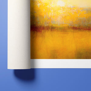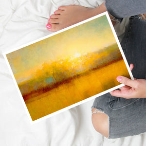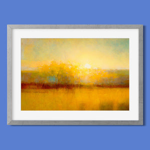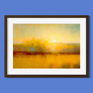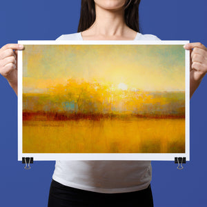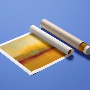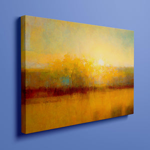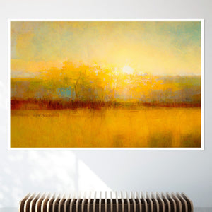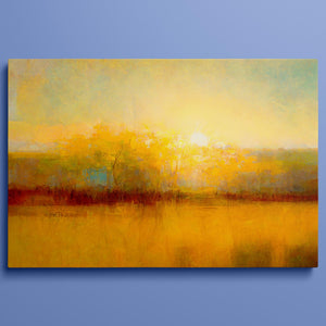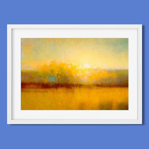 "Sunrise over the Savannah II" captures the breathtaking beauty of dawn with a harmonious blend of warm hues. This abstract landscape painting features shimmering shades of orange, beige, blue, and yellow, evoking a sense of tranquility and peace as the sun rises over vast open fields. The soft edges and impressionistic style invite viewers to immerse themselves in the serene atmosphere of nature, making it a perfect addition to any art collection.