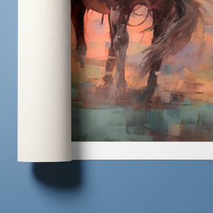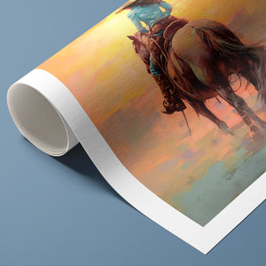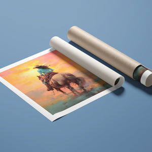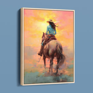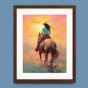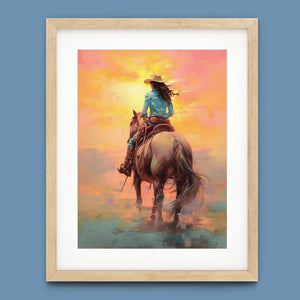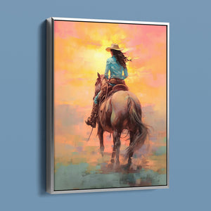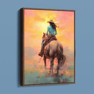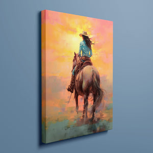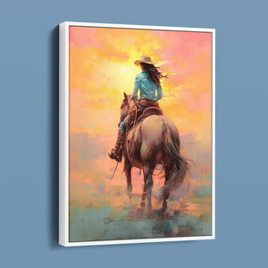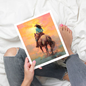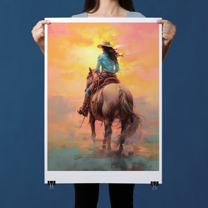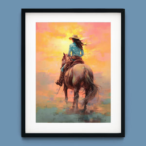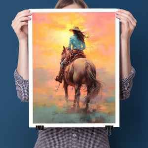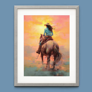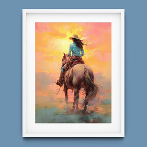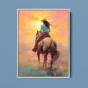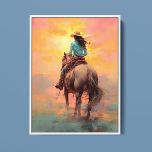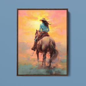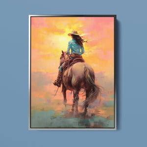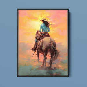Sunset Dreams - Cowgirl Riding into a Bold Colorful Sunset