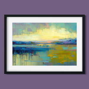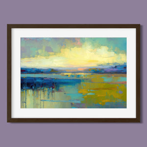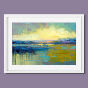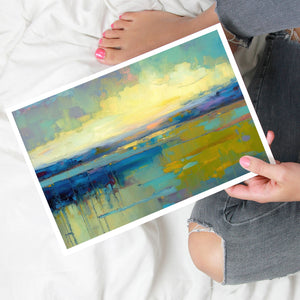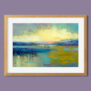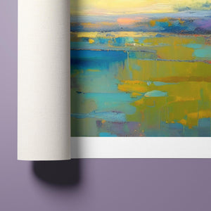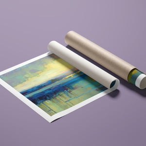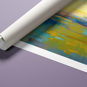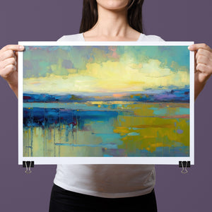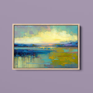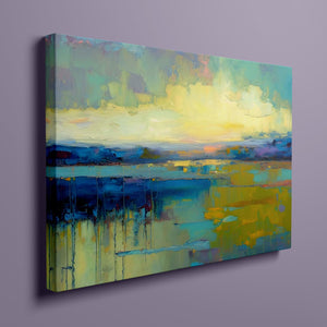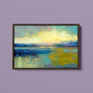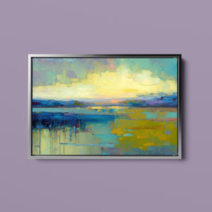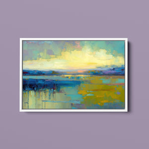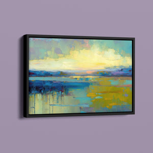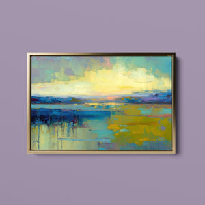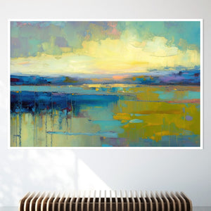 "Sunset Over Calm Water" is a serene abstract painting that captures the tranquil beauty of dusk reflected in calm waters. With its harmonious blend of pastel yellows, blues, and oranges, this artwork evokes a sense of peacefulness and relaxation. The smooth textures and luminous horizon create an ethereal atmosphere, making it a perfect addition to any space seeking a touch of nature-inspired elegance.