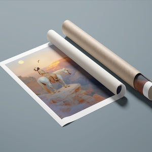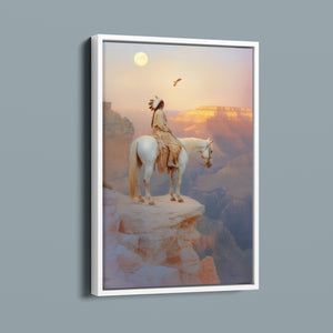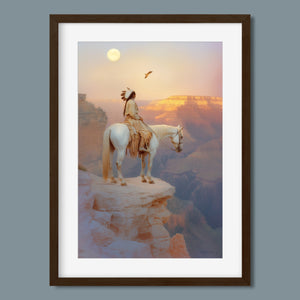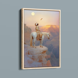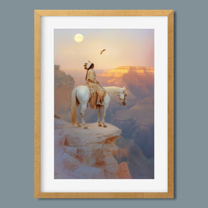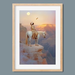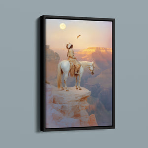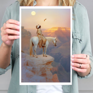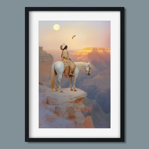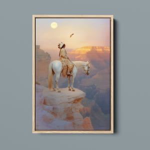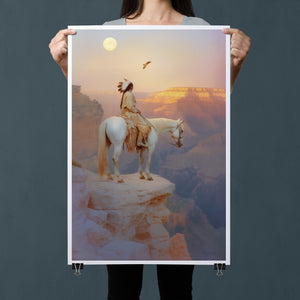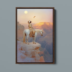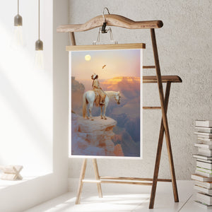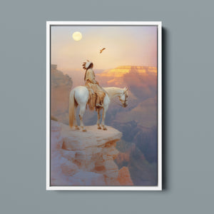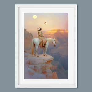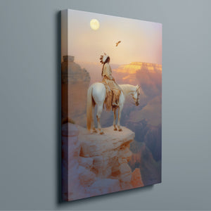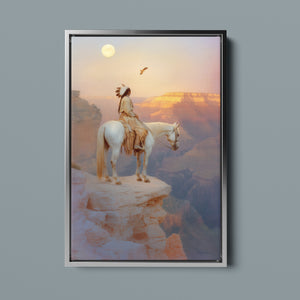 From the Spirit + Stone Collection, Sunset Over the Sacred Divide is a captivating antique-style artwork that transports viewers to the untamed American West. This evocative piece features a lone Native American brave astride his faithful steed, silhouetted against a breathtaking sunset. Perched atop a towering cliff, the warrior gazes out over a vast, majestic wilderness, where distant mountains are bathed in the warm, golden hues of dusk. The scene is further enhanced by the presence of an eagle soaring through the distant sky, symbolizing freedom and spiritual connection. This stunning vintage-inspired image captures the essence of a bygone era, celebrating the deep bond between indigenous peoples and their ancestral lands.