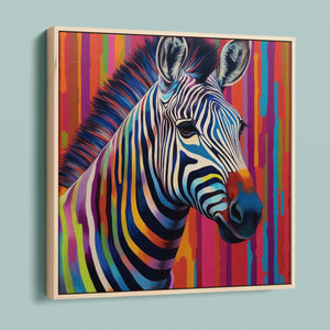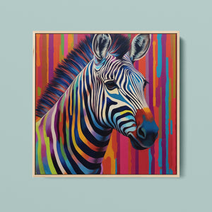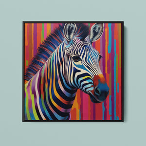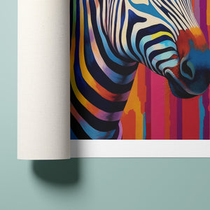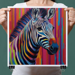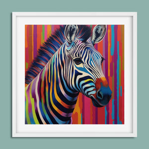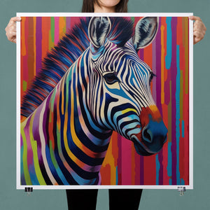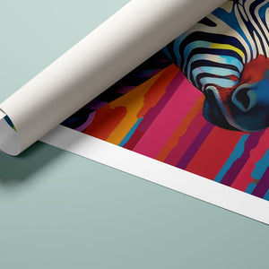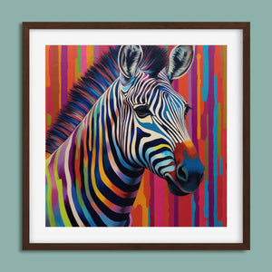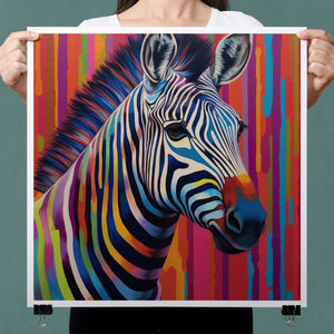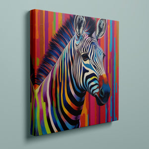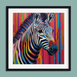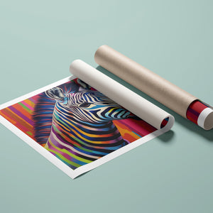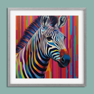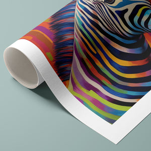 Technicolor Zebra, a vibrant artwork featuring a multicolored zebra with bold, abstract stripes, showcasing cheerful and radiant patterns in a whimsical and modern design.