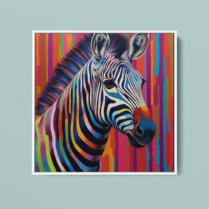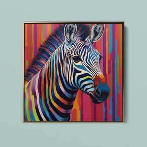 "Technicolor Zebra" is a vivid and whimsical artwork showcasing a zebra adorned with multicolored stripes. The painting features a bold and abstract design, capturing the essence of creativity and modernity with a spectrum of vibrant, cheerful colors that bring the zebra to life.