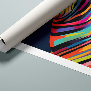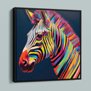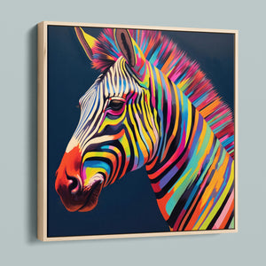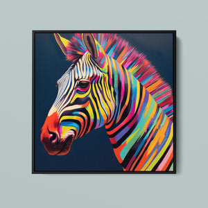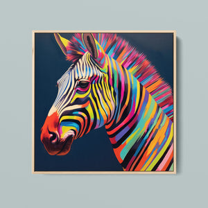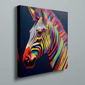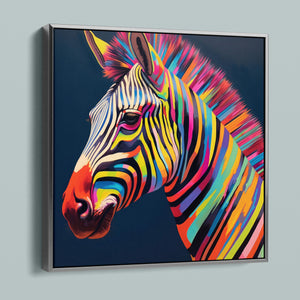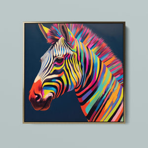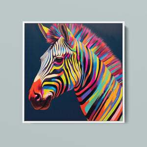 "Technicolor Zebra II" is a vibrant portrait of a zebra, rendered in multicolored stripes that highlight its exotic and whimsical nature. This artwork blends bold and abstract design with a contemporary flair, showcasing bright and creative elements that make it a striking addition to any modern art collection.