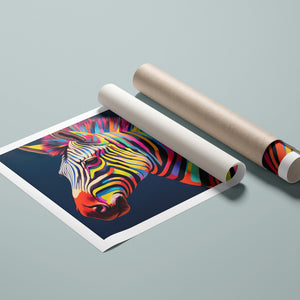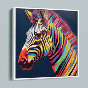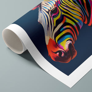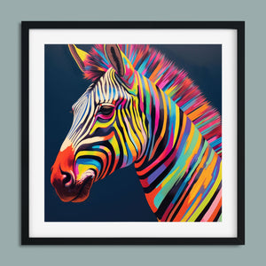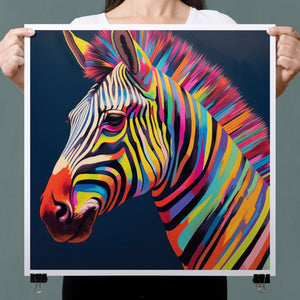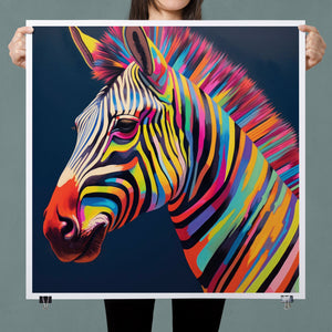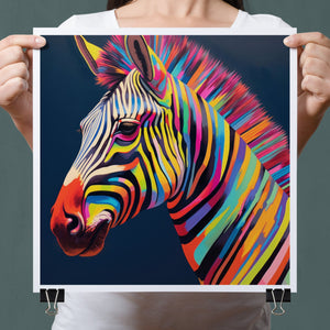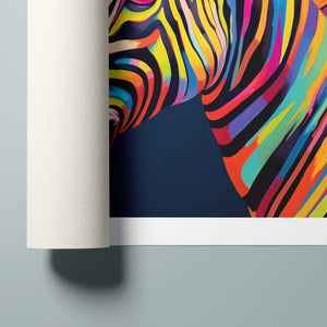 Technicolor Zebra II, a vibrant and imaginative portrait of a zebra with multicolored stripes, featuring bold and abstract design elements in a striking and contemporary style.