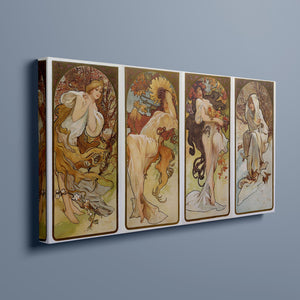 Art Nouveau illustration of the four seasons by Alphonse Mucha featuring women and nature.