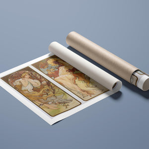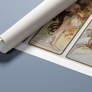 This exquisite Art Nouveau artwork, "The Four Seasons," created by Alphonse Mucha in 1896, beautifully represents the essence of each season through graceful female figures adorned with flowers and leaves. The intricate design showcases the elegance and harmony of nature, highlighting the transition from spring to summer, autumn, and winter. Mucha’s use of flowing lines and organic shapes creates a sense of movement, while the warm and cool color palettes enhance the symbolic beauty of each season. This decorative masterpiece is a testament to Mucha’s artistic genius and his ability to intertwine femininity with nature.