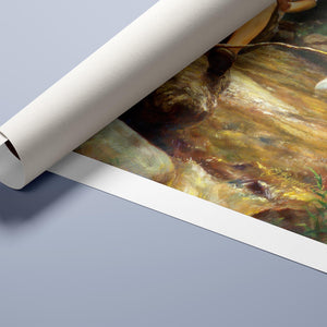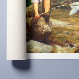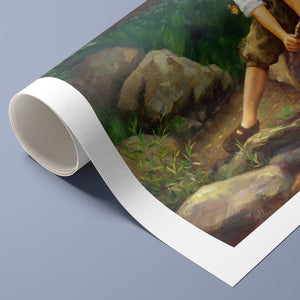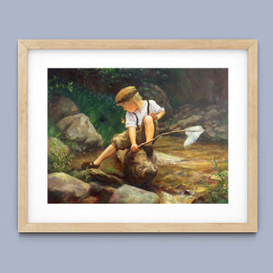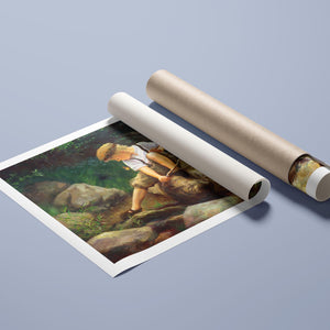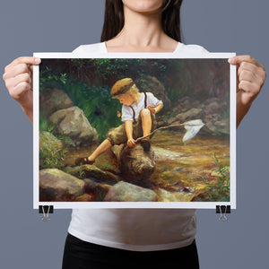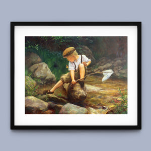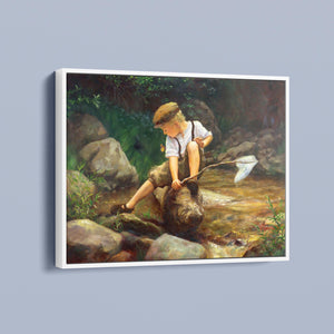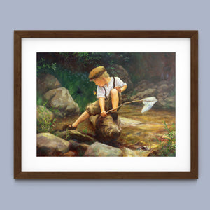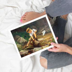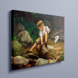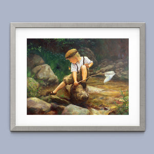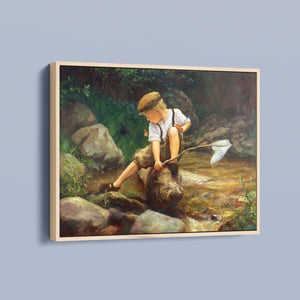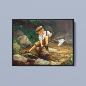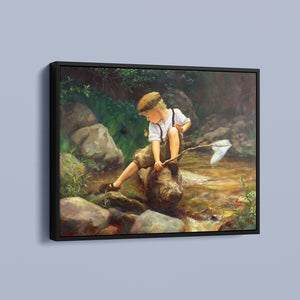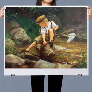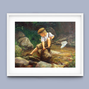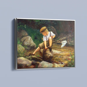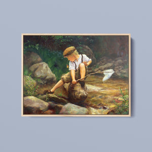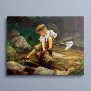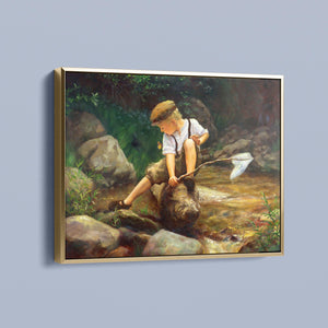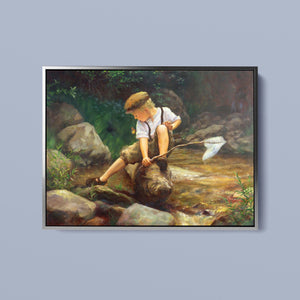 Immerse yourself in the serenity of The Predicament, an inspirational artwork depicting a child’s curious exploration of nature. This tranquil scene, featuring a child in shorts and a hat, examining a butterfly by a stream, captures the essence of youthful curiosity and solitude. Rendered in soothing greens, browns, and blues, the painting highlights the peaceful interaction between a child and the natural world.