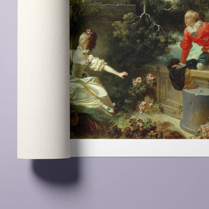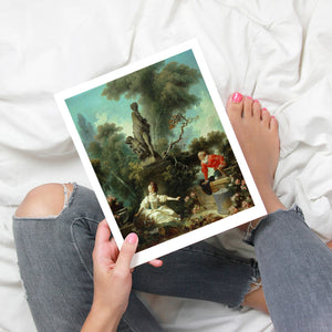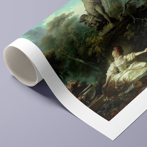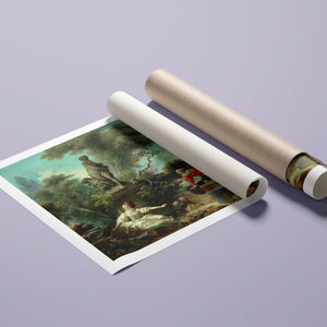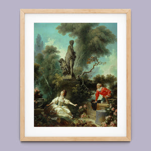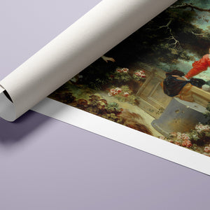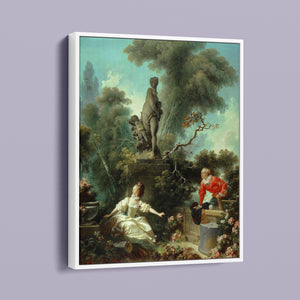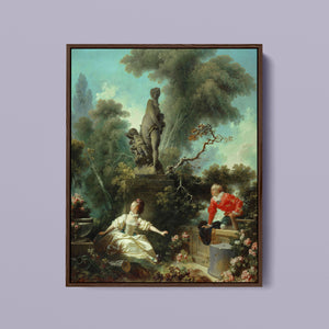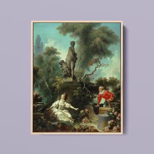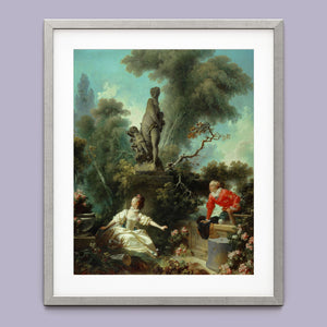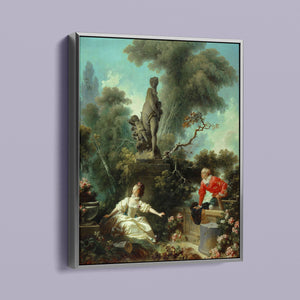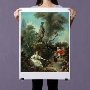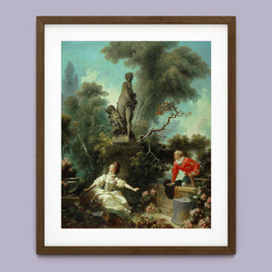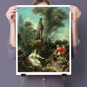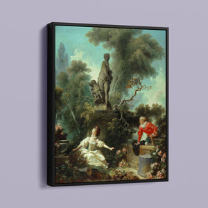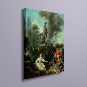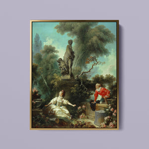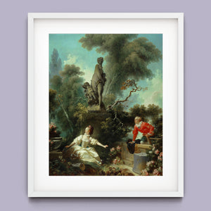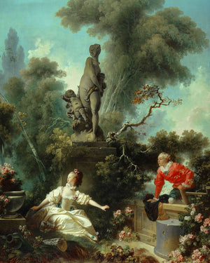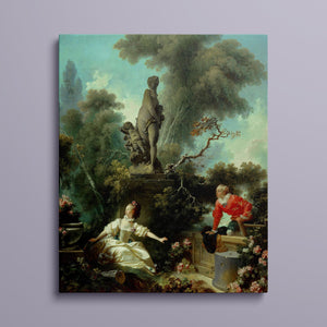 "The Progress of Love - The Meeting" by Jean-Honoré Fragonard is a renowned 18th-century painting that epitomizes the elegance and whimsy of the Rococo era. This vibrant artwork depicts a romantic rendezvous in a lush, idyllic garden, where the lovers meet amidst a setting of rich, pastel colors and elaborate details. The painting captures the playful and sophisticated nature of 18th-century French art, with its intricate composition and expressive portrayal of romance. Fragonard's use of light and texture enhances the painting's charm and allure, making it a celebrated piece in the history of art and a quintessential example of Rococo style.