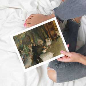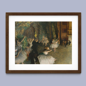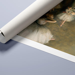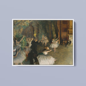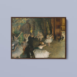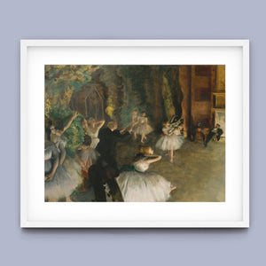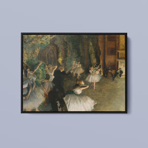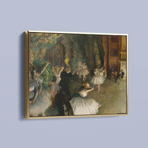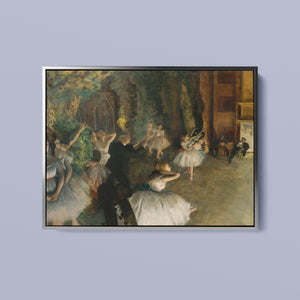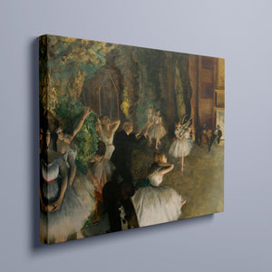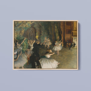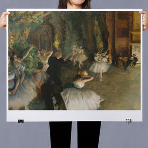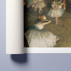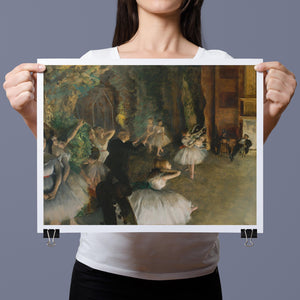 19th-century Impressionist painting by Edgar Degas showing ballet dancers rehearsing on stage, highlighting elegance and motion in a classic theatrical setting.