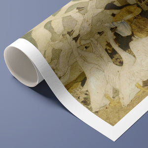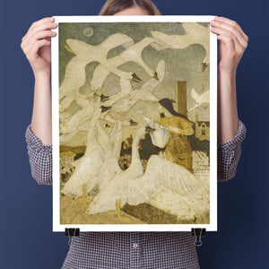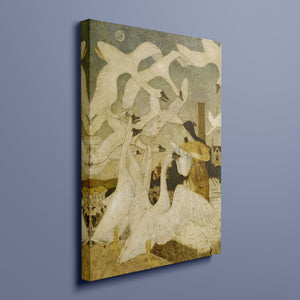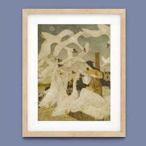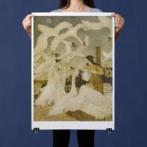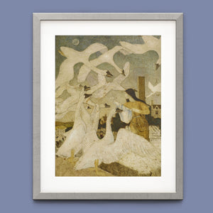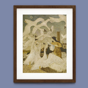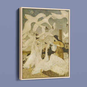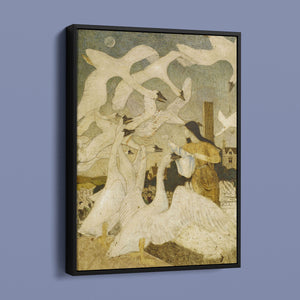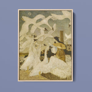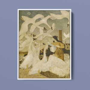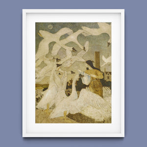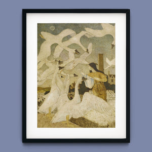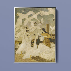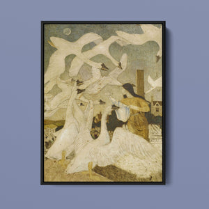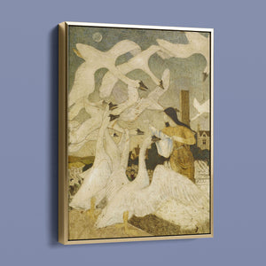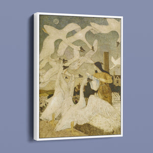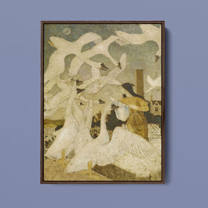 Explore "The Wild Swans - Twelve Brothers Turned Into Swans" by Arthur Joseph Gaskin, a classic vintage illustration that captures the magical transformation of twelve brothers into elegant swans. This enchanting artwork, rich in folklore and fantasy, showcases their flight and metamorphosis with a painterly, ethereal quality, evoking the charm of medieval fairytales.