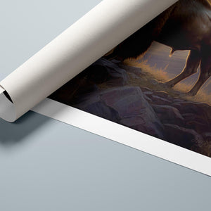"Thunder Rolls on Bison Ridge" portrays a majestic buffalo on a ridge, with a stormy sky looming over a vast valley in the Rocky Mountains. This painting encapsulates the rugged spirit of the American West and the timeless beauty of its wildlife.
