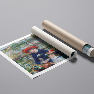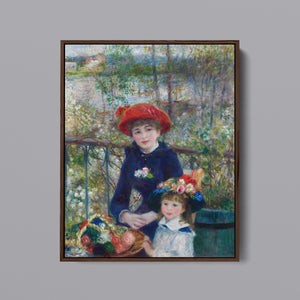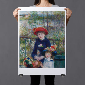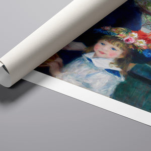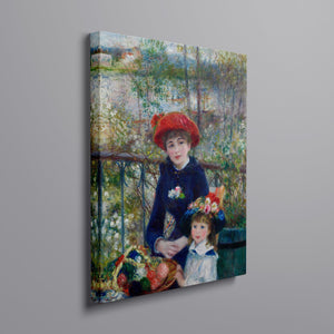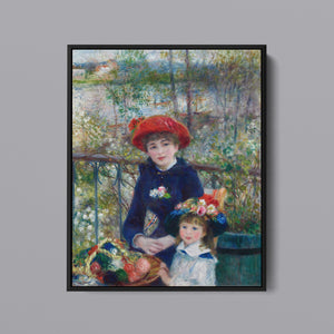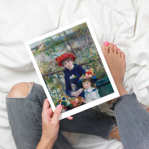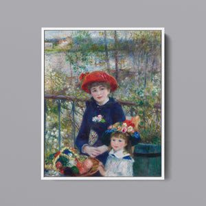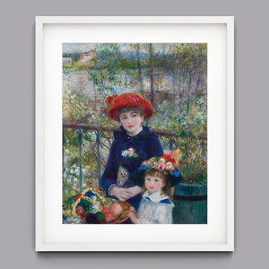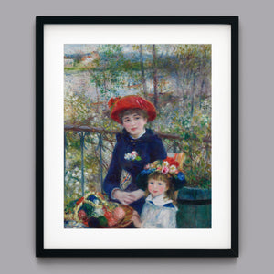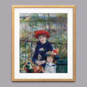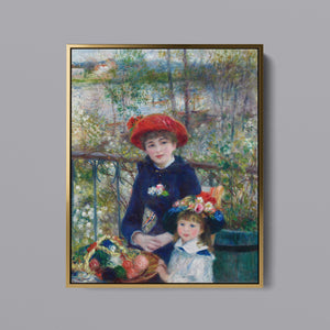 "Two Sisters – On the Terrace" by Pierre-Auguste Renoir is a quintessential example of Impressionist art, created in 1881. The painting depicts two young women, one standing and one seated, enjoying a leisurely moment on a terrace. Renoir’s use of vibrant colors, soft brushstrokes, and light effects beautifully conveys the warmth and tranquility of the scene. The lush outdoor setting, characterized by the dappled sunlight and floral surroundings, enhances the sense of relaxation and elegance. Renoir’s attention to the delicate interplay of light and shadow, along with his focus on the figures’ graceful poses and expressions, captures the essence of a serene afternoon, making this painting a beloved representation of 19th-century French art and Impressionist sensibilities.