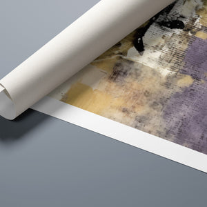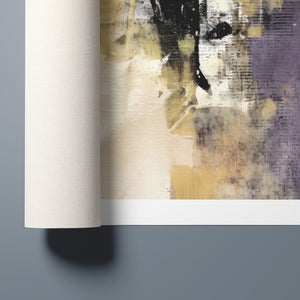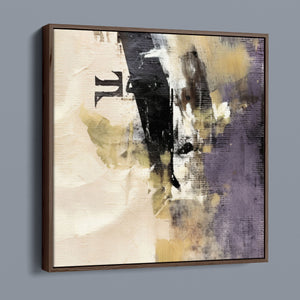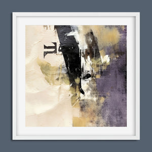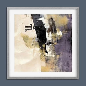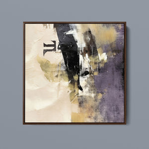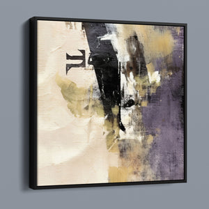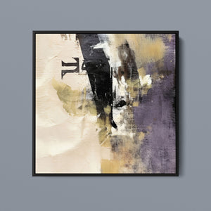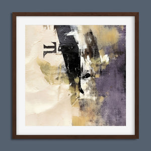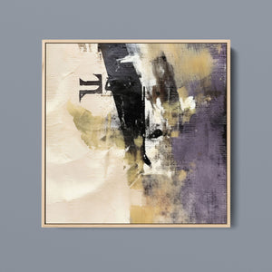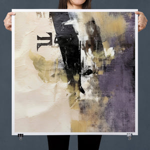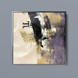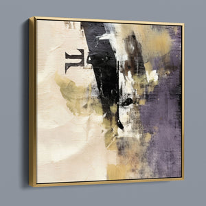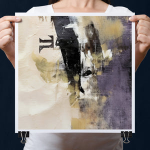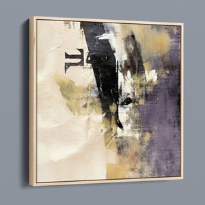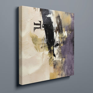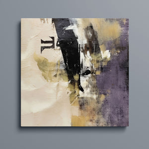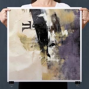 "Typo - Pi Squared" is a contemporary abstract artwork that creatively interprets the pi symbol squared. The piece combines neutral tones with accents of black, gold, and purple, offering a textured and intriguing addition to modern decor.