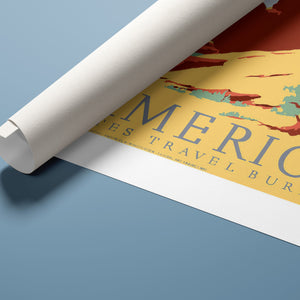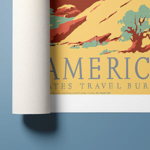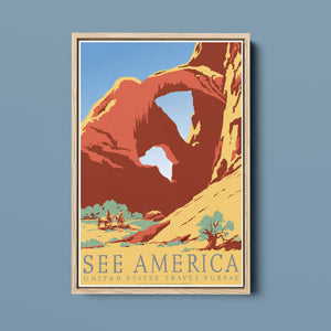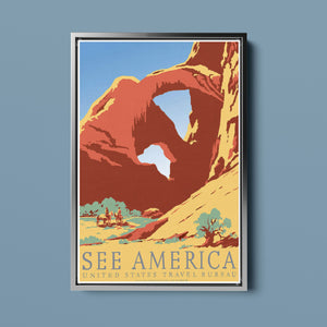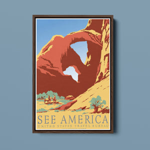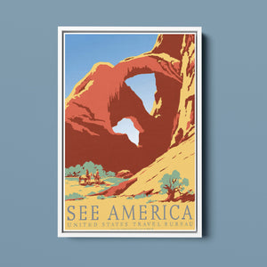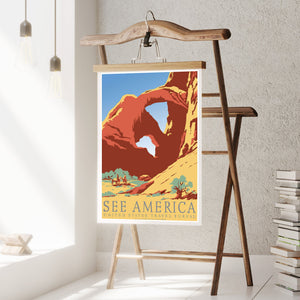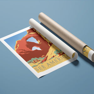 Embrace the spirit of adventure with this vintage travel poster showcasing Utah's breathtaking arches. With its warm hues of orange, brown, and beige, this colorful illustration captures the essence of America’s majestic national parks. Featuring bold typography and a nostalgic design, it invites viewers to explore the stunning red rock formations and vast desert landscapes. Perfect for travel enthusiasts or anyone longing for outdoor exploration, this artwork beautifully represents the natural beauty and adventurous spirit of Utah, making it a striking addition to any wall.