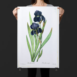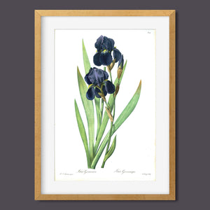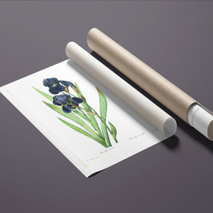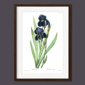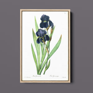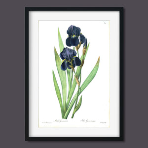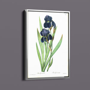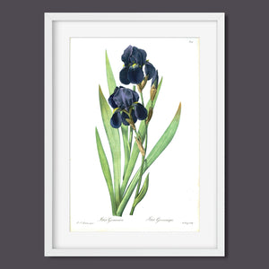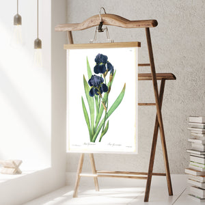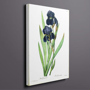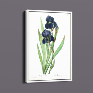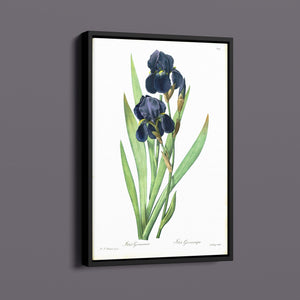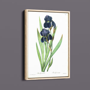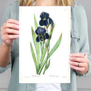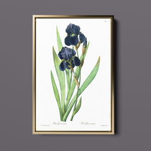 "Vintage Botanical Flower - Iris Germanica Black" features a beautifully detailed illustration of the Iris Germanica, known for its striking dark hues and elegant petals. This vintage botanical art captures the intricate beauty of the plant, showcasing its lush green leaves and rich purple and navy blooms. Perfect for nature lovers and those who appreciate classic horticultural art, this piece brings a touch of botanical elegance to any decor.