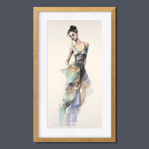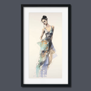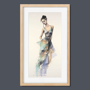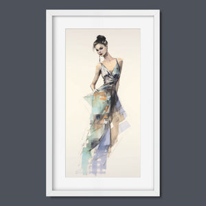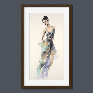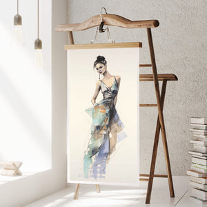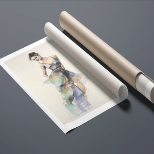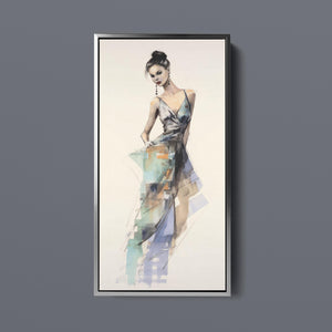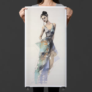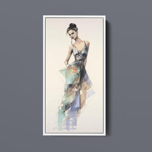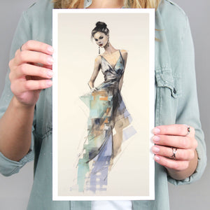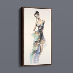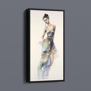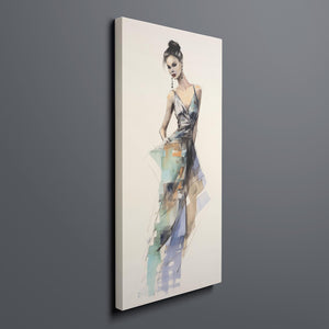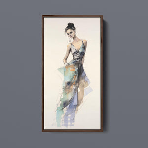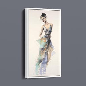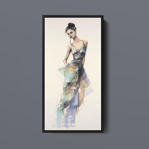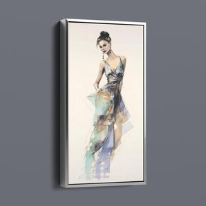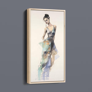 "Vintage Fashion Illustration" embodies timeless elegance with its chic watercolor portrayal of a stylish woman in a flowing dress. With soft shades of beige, blue, and white, this artwork exudes grace and femininity, capturing the beauty of classic fashion design. The delicate brushstrokes and play of light and shadows give it a dynamic, modern feel, making this piece perfect for fashion lovers and art enthusiasts alike.