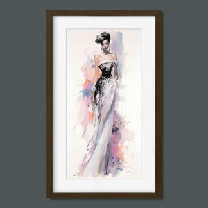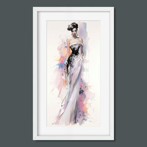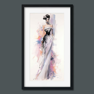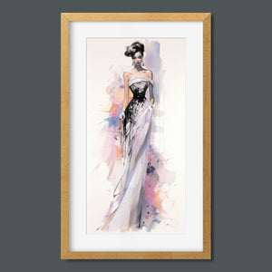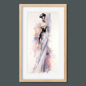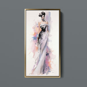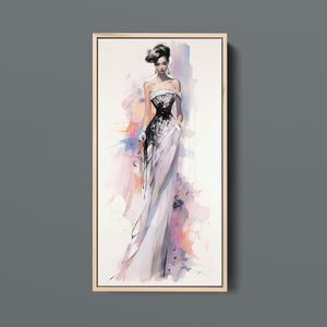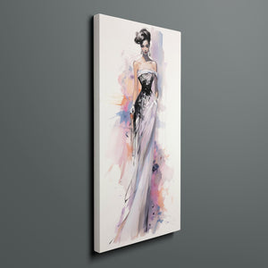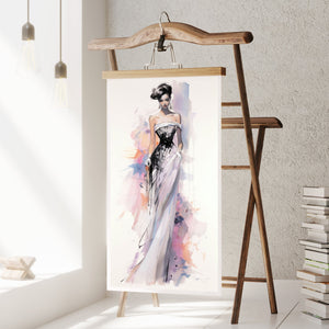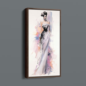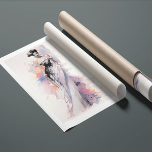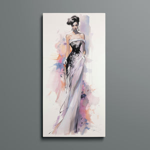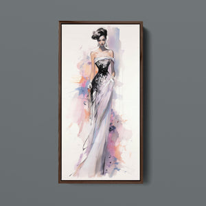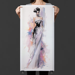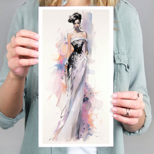 "Vintage Fashion Illustration" embodies timeless elegance with its chic watercolor portrayal of a stylish woman in a flowing dress. With soft shades of beige, blue, and white, this artwork exudes grace and femininity, capturing the beauty of classic fashion design. The delicate brushstrokes and play of light and shadows give it a dynamic, modern feel, making this piece perfect for fashion lovers and art enthusiasts alike.
