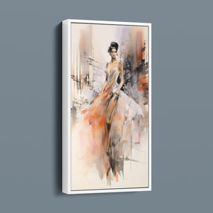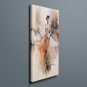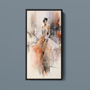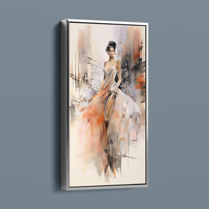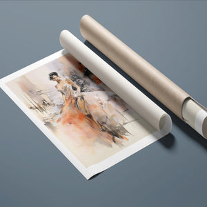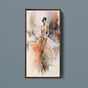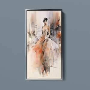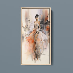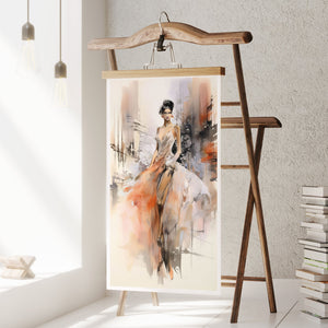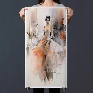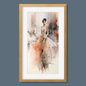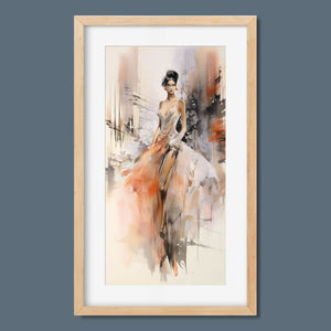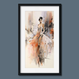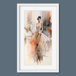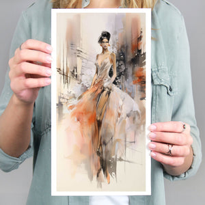 "Vintage Fashion Illustration" embodies timeless elegance with its chic watercolor portrayal of a stylish woman in a flowing dress. With soft shades of beige, blue, and white, this artwork exudes grace and femininity, capturing the beauty of classic fashion design. The delicate brushstrokes and play of light and shadows give it a dynamic, modern feel, making this piece perfect for fashion lovers and art enthusiasts alike.