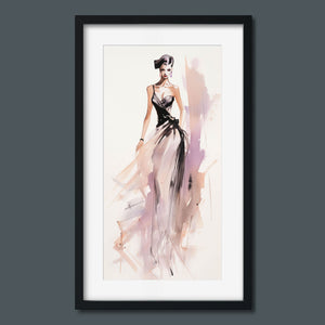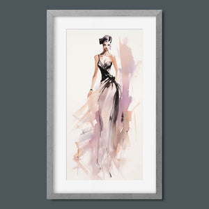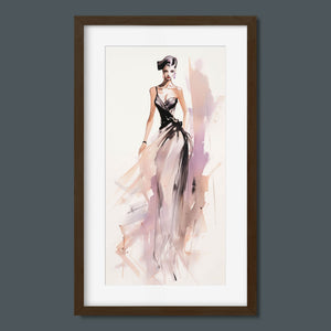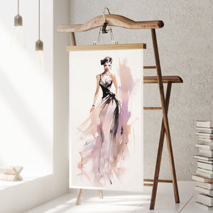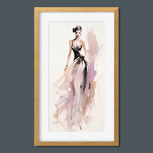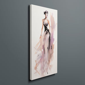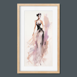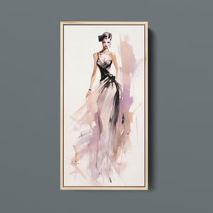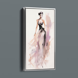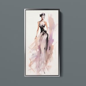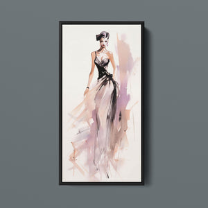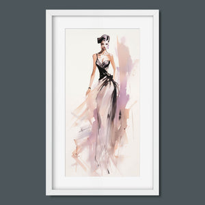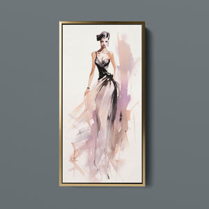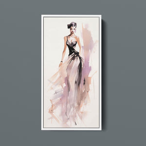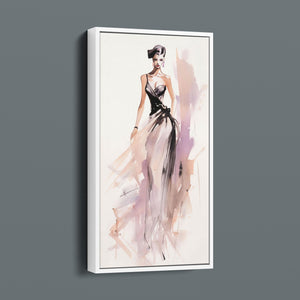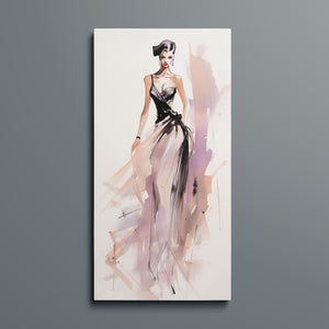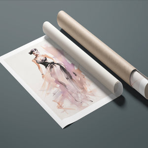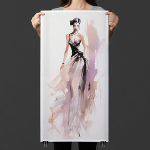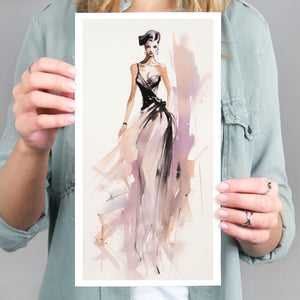"Vintage Fashion Illustration" embodies timeless elegance with its chic watercolor portrayal of a stylish woman in a flowing dress. With soft shades of beige, blue, and white, this artwork exudes grace and femininity, capturing the beauty of classic fashion design. The delicate brushstrokes and play of light and shadows give it a dynamic, modern feel, making this piece perfect for fashion lovers and art enthusiasts alike.