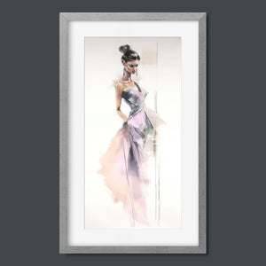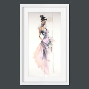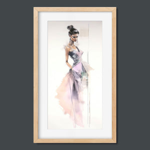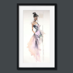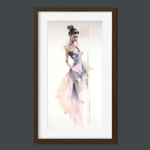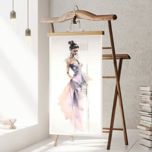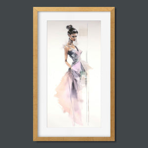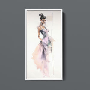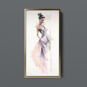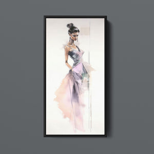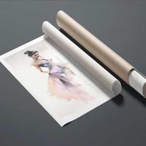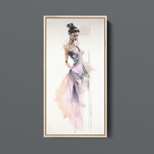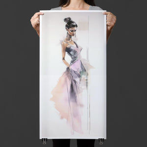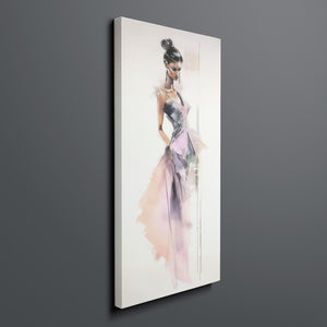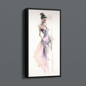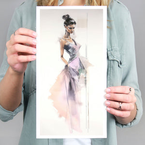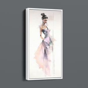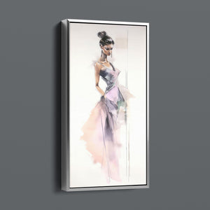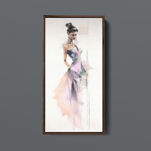 "Vintage Fashion Illustration" embodies timeless elegance with its chic watercolor portrayal of a stylish woman in a flowing dress. With soft shades of beige, blue, and white, this artwork exudes grace and femininity, capturing the beauty of classic fashion design. The delicate brushstrokes and play of light and shadows give it a dynamic, modern feel, making this piece perfect for fashion lovers and art enthusiasts alike.
