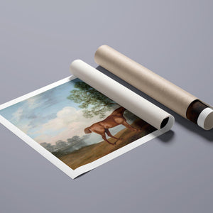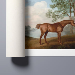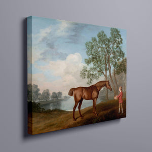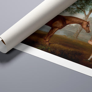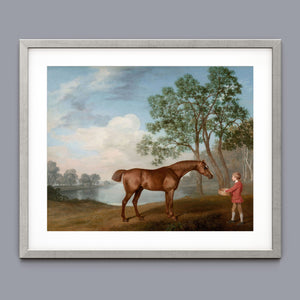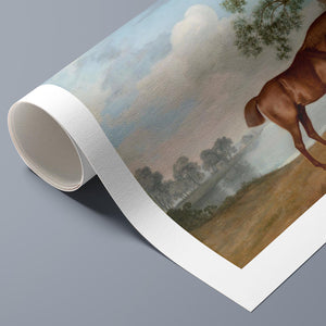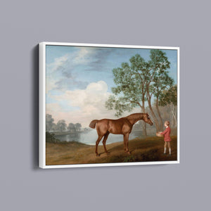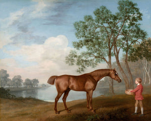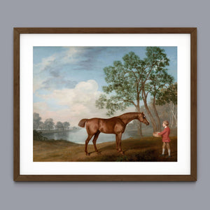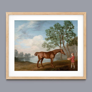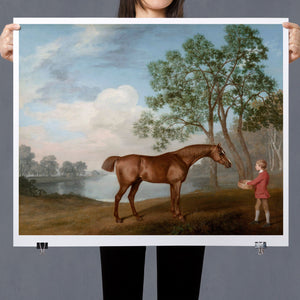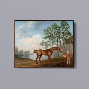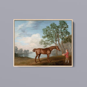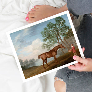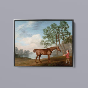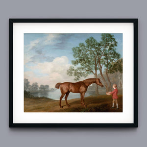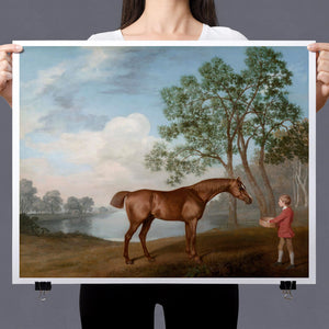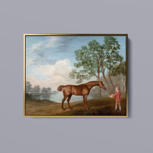 This vintage horse painting, attributed to an unknown artist, captures the essence of 18th-century pastoral art with its tranquil and idyllic rural scene. The artwork features a chestnut horse in a serene landscape, where a child is seen feeding the animal amidst a lush setting of trees, foliage, and a gentle river. The use of earthy tones like blue, green, and brown enhances the painting’s classic and timeless quality, reflecting the harmonious bond between humans and animals. The depiction of the pastoral afternoon scene, with its detailed rendering of grass and water, evokes a sense of peace and nostalgia. This piece not only showcases the artist's skill in portraying rural life but also highlights the charm of vintage art with its serene and picturesque representation of nature.