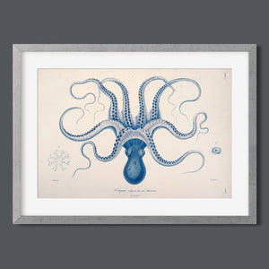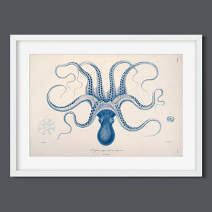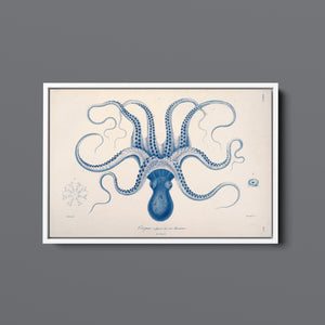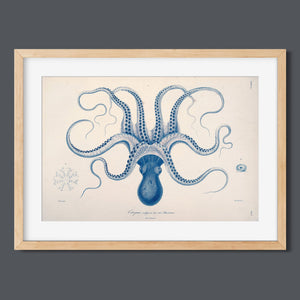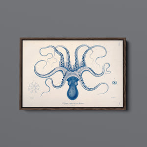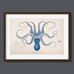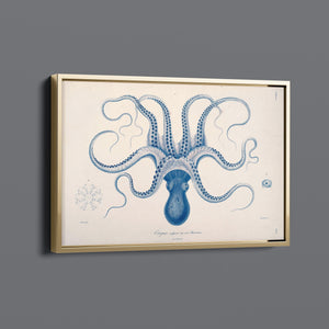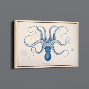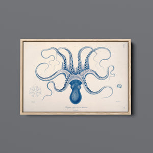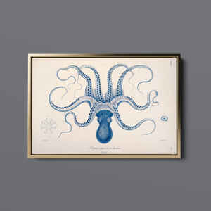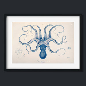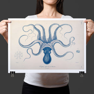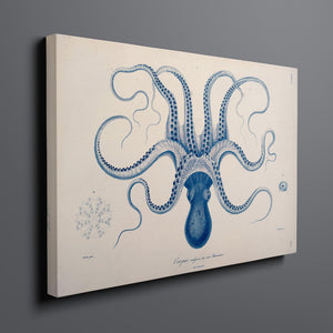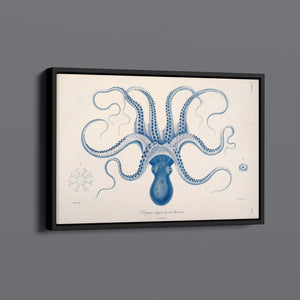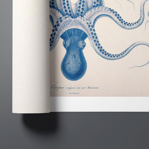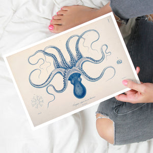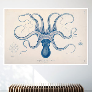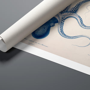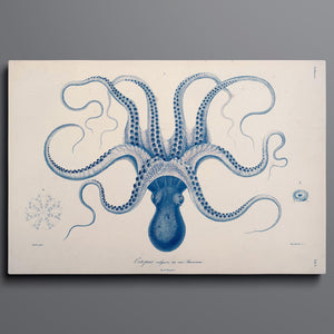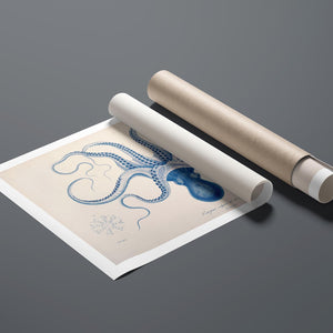 "Vintage Octopus Sea Creature Illustration" showcases the intricate beauty of this fascinating marine animal. With its detailed engraving style, the artwork captures the octopus's graceful tentacles and unique features, all presented in a sophisticated palette of black, beige, and blue. Perfect for ocean lovers and collectors of vintage art, this illustration serves as a stunning tribute to the complexity of marine biology and oceanography.