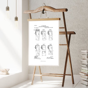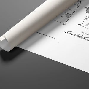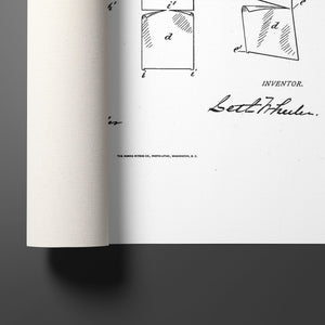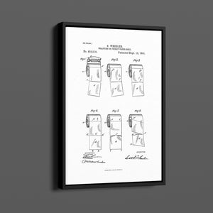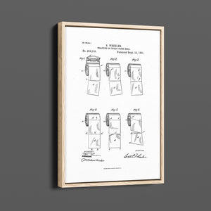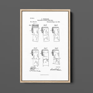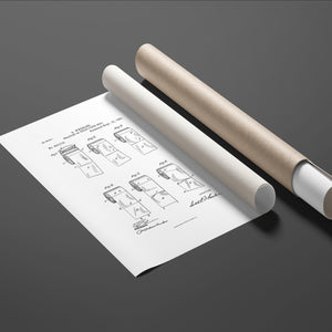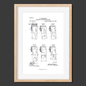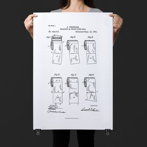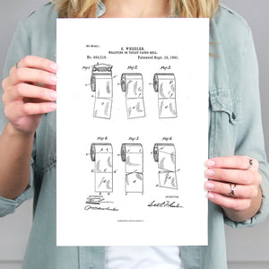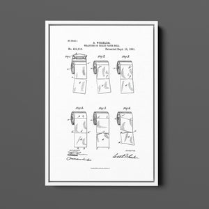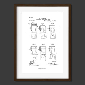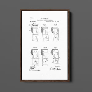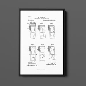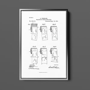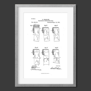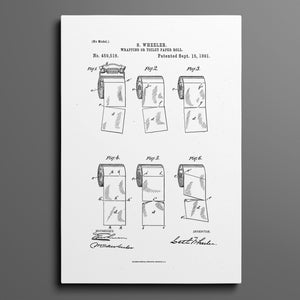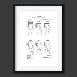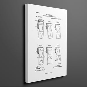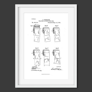 "Vintage Patent Illustrations - Toilet Paper" features an antique patent drawing from 1891, showcasing the innovative design of toilet paper. This unique illustration includes detailed diagrams of the roll, perforations, and dispenser mechanisms, capturing the essence of hygiene and convenience. Perfect for collectors of quirky historical artifacts or anyone interested in the evolution of everyday items, this artwork brings a touch of nostalgia and humor to any space.